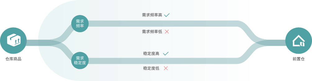 利用仓库发货数据,根据货品的需求频率和需求稳定度两个维度来进行选品分析,选择需求频率高、需求稳定度高的短尾产品实现前置仓的周转率,减少需求频率极低、需求稳定度不高的长尾产品,降低库存成本。