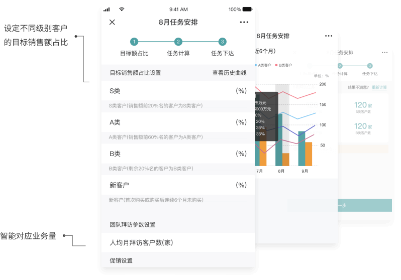 根据每个省市区业务员的基础信息数据、行为数据、销售数据以及公司的目标值,对业务员推送精准的客户类型以及对应的拜访数。